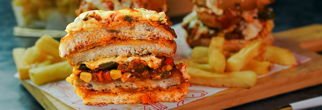 Add a spoonful of pizza mixture on top of the burger. Add cheddar cheese and bake in a preheated oven at 180°C for 3-4 minutes.