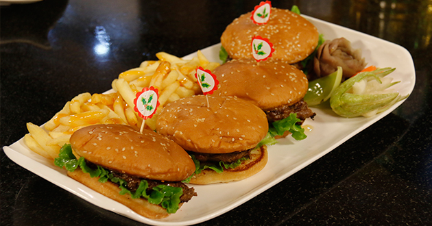 Now heat oil, fry chopped onions till light golden and in marinated steak, fry well for 4 minutes each side. Drizzle some Worcestershire Sauce, when beef is done add in flour with cream, mix and cook for another 3-4 minutes. Remove when sauce is thick. Cut buns, heat and spread butter on it. Place salad leaf topped with steak and its sauce. Cover with another bun and serve with fries.