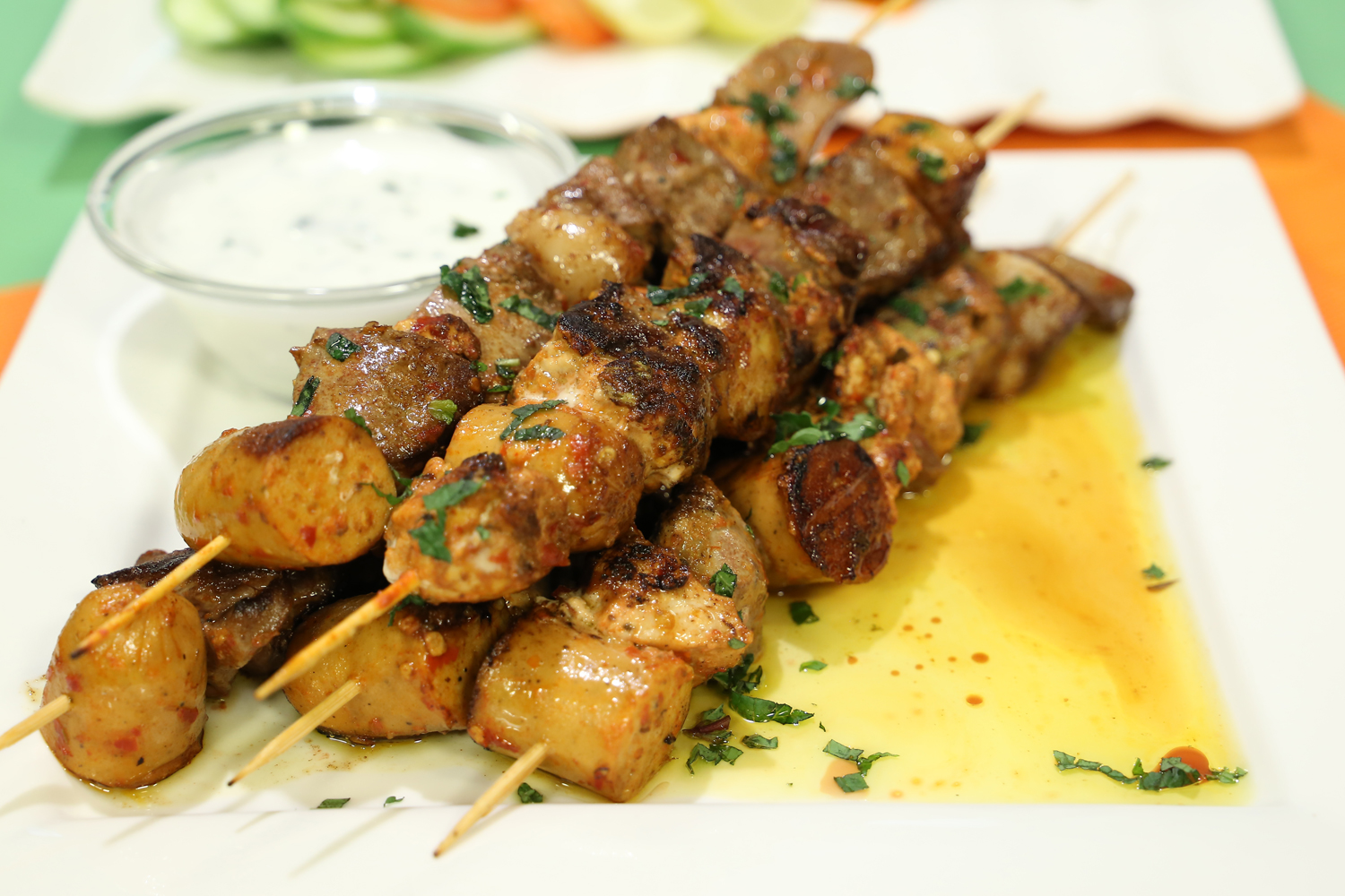- Now marinate liver, heart , sausages and beef in the mixture and stick it on skewers , now grill it on grill pan with oil.
