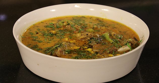 Heat quarter cup oil, fry add one chopped onion with red chili whole, black pepper, and remove. Grind this mixture with coconut milk and turmeric. In another pan add remaining quarter cup oil fry ginger garlic, curry leaves, and boil mutton. Fry well add grinded mixture, cover and cook for 15 minutes. Heat 2 tbsp oil fry mustard seeds, one chopped onion until brown. Add to the curry with sweet corn, mix and serve.