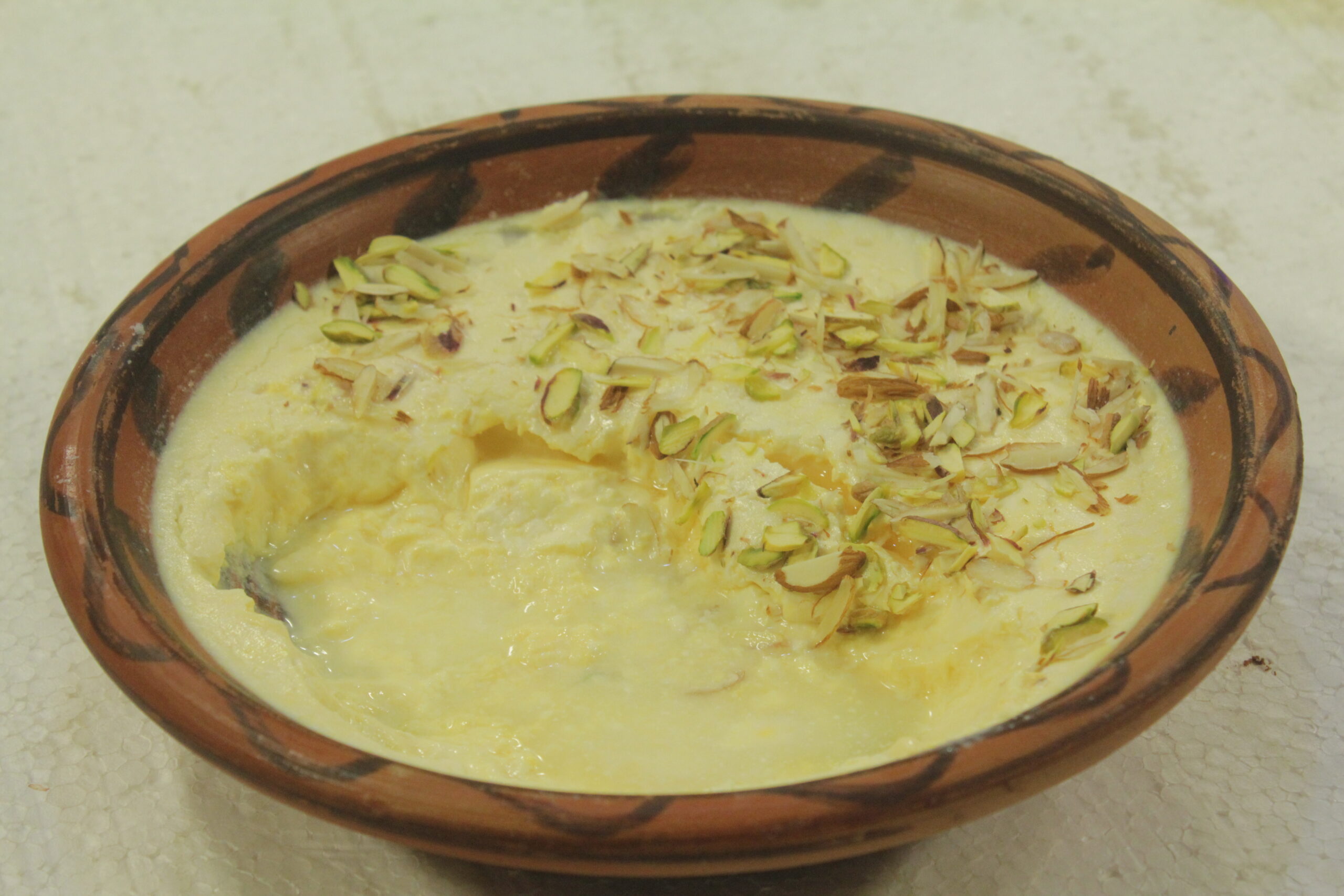 In a pan add 1 ½milk and boil till it changes color and reach to 1 liter. Then turn off the flame. Cool it to room temperature. Then add 2 tbsp sour yogurt, few drops of kewra essence and 1 pinch of food color to mix. the pour it in clay pot and wrap it and leave it on a dark place. When it gets ready garnish with almond pistachio and serve.