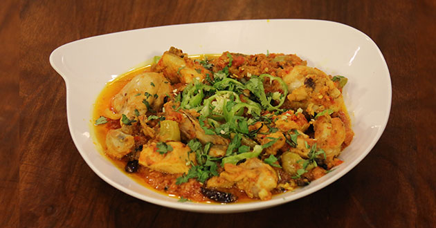 Marinate chicken with ginger garlic paste, vinegar, crushed coriander, bay leaves, black peppercorns, turmeric powder,salt, crushed green chilies and leave it 1 hour.